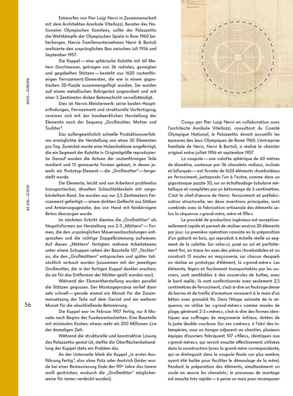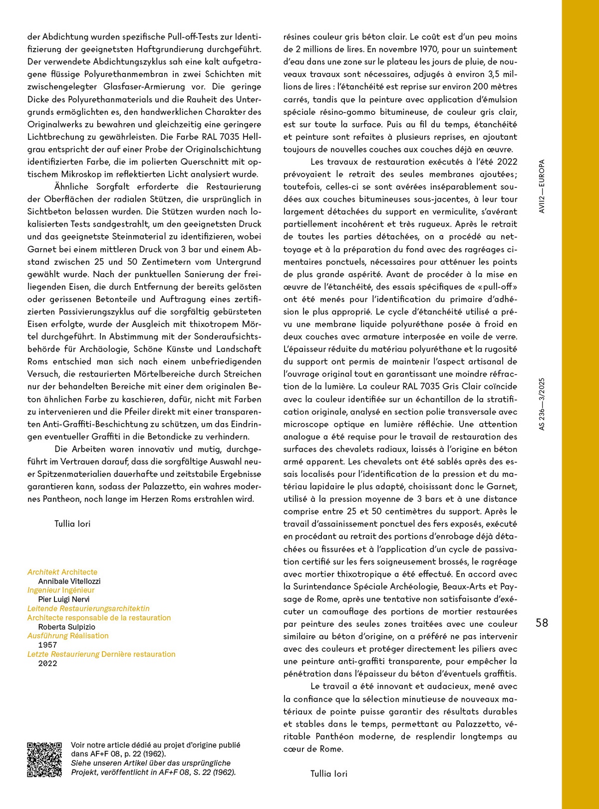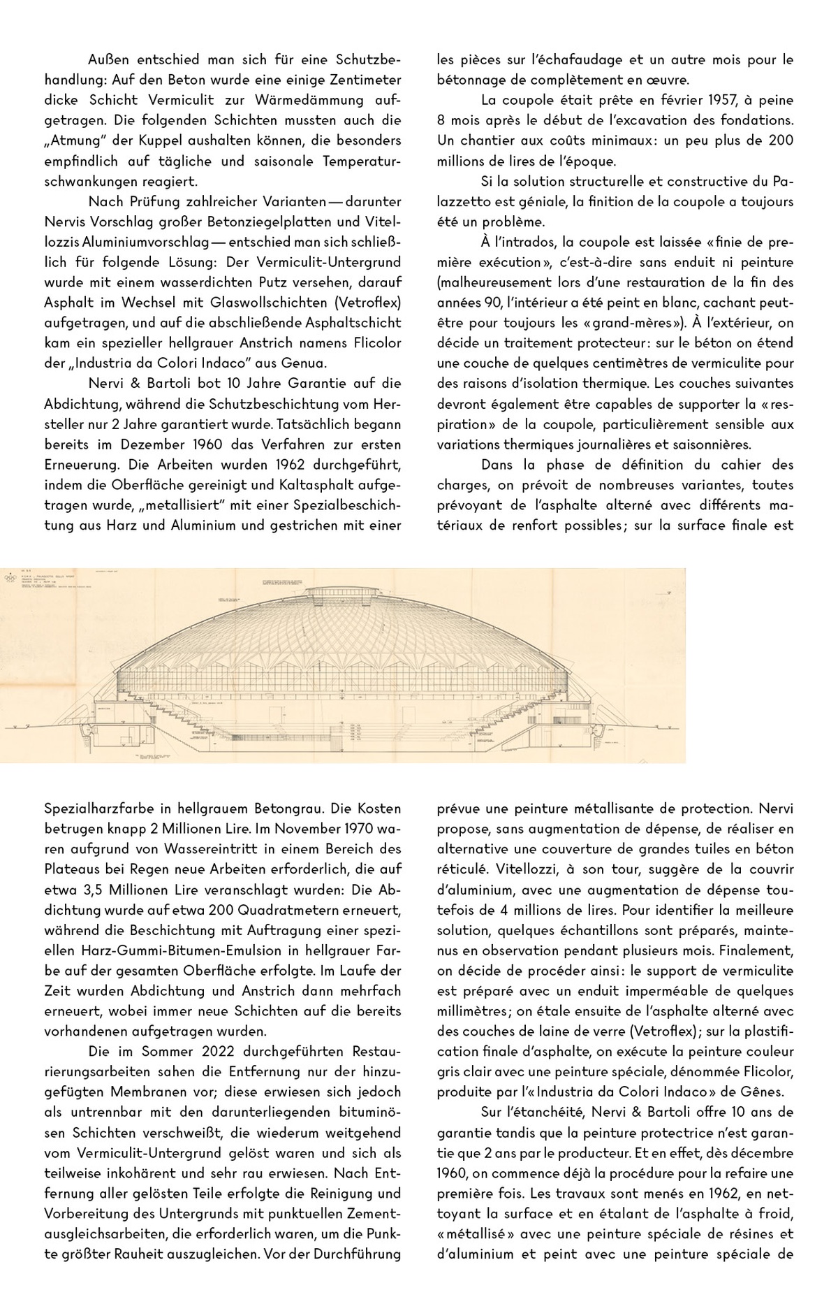 Le Palazzetto dello Sport de Pier Luigi Nervi à Rome a enfin retrouvé sa splendeur grâce à l’intervention de restauration conservatrice financée par le propriétaire actuel, Roma Capitale, après un long processus de projet confié à Risorse per Roma, dont les travaux ont été solidement dirigés par l’architecte Roberta Sulpizio. La coupole la plus célèbre du xxe siècle n’a eu besoin d’aucune intervention de caractère structurel : elle a toutefois enfin retrouvé sa couleur d’origine, gris clair, après des années où elle apparaissait noire, en raison de la perte complète de la peinture protégeant l’étanchéité. Les travaux